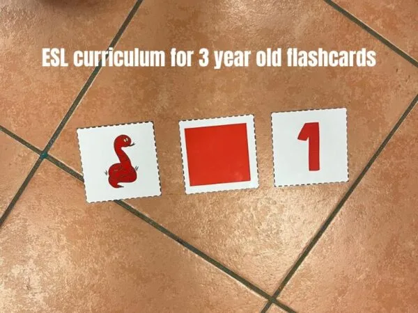 Esempio del curriculum ESL per bambini di tre anni: Il nostro set di materiali include flashcard con il vocabolario introdotto in ogni lezione: un numero, un animale e un colore. Queste carte sono perfette per giochi come il memory o “scatta una foto” per rinforzare l’apprendimento.