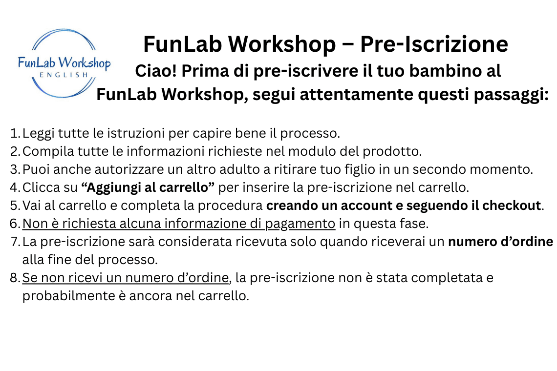 Questo sistema sostituisce i vari moduli Google e rende tutto più semplice e veloce per le famiglie! Se desiderate iscrivere più di un bambino, potete semplicemente aggiungere un’altra prenotazione di questo prodotto al vostro carrello.